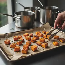 Line a large baking sheet with parchment paper. Spread the seasoned sweet potato cubes on the sheet in a single, even layer. Make sure the pieces are not overlapping. Place the sheet in the preheated oven and bake for 25-30 minutes. Halfway through baking (after about 15 minutes), remove the sheet and stir the sweet potatoes with a spatula to ensure they brown evenly. The finished sweet potatoes should be soft in the center (check with a fork) and slightly caramelized on the outside.