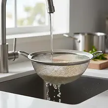 While the sweet potatoes are baking, cook the quinoa. Place the quinoa in a fine mesh strainer and rinse it thoroughly under cold running water for about a minute, stirring it with your hand. Transfer the rinsed quinoa to a small pot, add 200 ml of water (1:2 ratio of quinoa to water) and a pinch of salt. Bring to a boil, then reduce the heat to the minimum, cover the pot, and cook for about 15 minutes, until all the water is absorbed. Remove the pot from the heat and let it sit covered for another 5 minutes. Finally, gently fluff the quinoa with a fork to separate the grains.