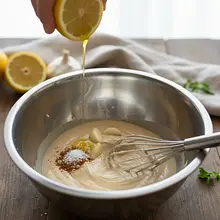 In a small bowl or jar, combine all the dressing ingredients: tahini paste, freshly squeezed lemon juice, maple syrup, and garlic (peeled and pressed through a garlic press or very finely chopped). Start mixing everything with a small whisk or fork. At first, the mixture may thicken and look curdled - this is normal. Gradually, adding one tablespoon of cold water at a time, continue mixing until the sauce reaches a smooth, creamy, and pourable consistency, similar to thin mayonnaise. Season to taste with a pinch of salt and pepper.