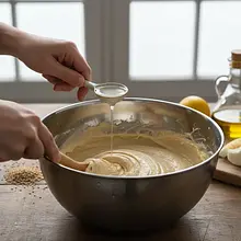 Continuing to stir, start adding cold water, one tablespoon at a time. After adding each tablespoon of water, mix vigorously until it is completely combined with the paste. Repeat this process, adding a total of about 3-4 tablespoons (45 ml) of water, until the sauce reaches a smooth, creamy, and pourable consistency, resembling thin mayonnaise. Finally, season the sauce with a pinch of salt and pepper to taste and mix once more.
