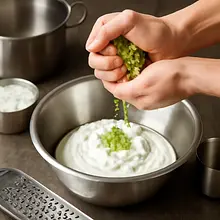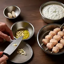 Prepare the marinade: peel and finely chop 2 cloves of garlic (10 g). In a small bowl, mix 30 g of olive oil, 30 ml of lemon juice (about 30 g), 4 g of dried oregano, 4 g of salt (part for the marinade), 1 g of pepper (1 pinch), and the crushed garlic. Mix with a fork or whisk to combine the ingredients — an emulsion with a uniform, slightly oily consistency will form.