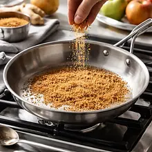 Heat a skillet over medium heat. Evenly sprinkle brown sugar onto the dry skillet and heat for 1-2 minutes, until the sugar starts to melt at the edges and takes on a dark amber color. Keep your hand above the skillet to sense the smell of caramel — it should be pleasant, not bitter.