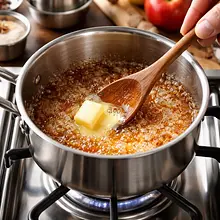 When the sugar is partially liquid, add the butter (30 g) and quickly stir with a wooden spoon until the butter melts and combines with the caramel. Then add the apple slices and stir to coat each slice with caramel. Fry for 3-4 minutes, stirring every 30 seconds — the slices should soften, and the edges should lightly brown, but not fall apart.
