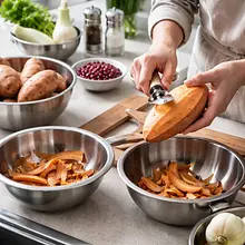 Preheat the oven to 200°C (conventional) or 190°C with fan. Wash the sweet potato, peel it (optional — the skin is edible) and cut it into cubes about 1–1.5 cm on each side for even roasting. Place the cut pieces in a large bowl, add 15 g of olive oil and a pinch of salt (1 g). Mix thoroughly with a spoon until the pieces are slightly shiny. Spread in a single layer on a baking sheet lined with parchment paper — do not stack the pieces on top of each other. Bake for 20–25 minutes, flipping with a spatula halfway through; they are done when the edges are golden brown and slightly caramelized.