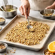 Spread the crumble evenly on a baking sheet lined with parchment paper. Bake at 180°C for 12–15 minutes, gently stirring the crumble every 6–7 minutes to ensure it browns evenly. Once baked, set aside to cool completely — the crumble will harden and become crispy.