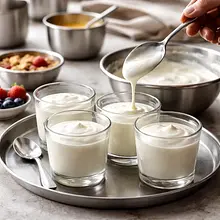 A light, seasonal dessert combining creamy Greek yogurt with the aroma of orange and cardamom, baked slices of persimmon, and a crunchy almond-oat crumble. The dish is quick to prepare and visually striking due to the contrast of the light cream, golden fruits, and darker crumble. Inspiration: contemporary home cooking, where simplicity and fresh ingredients take center stage. Serve in low glasses or cups, preferably chilled for a short while; it pairs wonderfully with spiced tea or espresso. Flavor profile: creamy, slightly tangy yogurt base, warm notes of cardamom and honey, and a sweet-nutty, crunchy crumble. Visual appeal: layers of cream and fruit, crumble topping, and green mint leaves for contrast.
