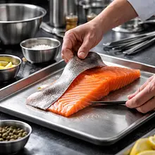 Check the salmon fillet: it should be cool, have a fresh smell, and a uniform color. Remove the skin (if present) and cut the fish into very thin slices or small cubes with a side of about 1 cm. To do this: use a long, sharp knife, hold the knife at an angle of 20–30° and with one smooth motion, slice through the meat without sawing back and forth.