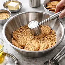 Prepare the base: place the digestive biscuits into a large plastic bag or bowl. If using a bag, seal it and crush with a rolling pin until you achieve fine, but not powdery crumbs (they should be the size of fine sand with a few smaller bits). If using a food processor, pulse 6–8 times. The total should yield about 150 g of crushed biscuits.