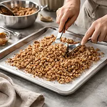 Spread the crumble evenly on the prepared baking sheet and bake at 180°C for 12–14 minutes, stirring every 5 minutes with a spatula to ensure even browning. Once baked, set aside to cool completely — the crumble will harden and become crispy.