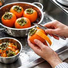 Wash the persimmons, cut off the top with the leaves, peel the skin (optional, the skin is edible but thin), and slice the fruit into 1 cm diagonal pieces. In a large skillet, heat 30 g of butter over medium heat. Sprinkle the persimmon slices with a thin layer of sugar (about 30 g evenly divided), arrange the slices in a single layer, and fry for 2–3 minutes on one side until they start to glaze and caramelize slightly. Gently flip and fry for 1–2 minutes on the other side. Finally, drizzle with lemon juice (20 ml) and 10 g of honey, stir gently for 15 seconds, and remove from heat.