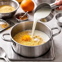 In a medium pot, pour in 400 ml of milk, add 120 g of rinsed groats, 1 pinch of salt, and the grated zest of an orange (6 g). Place over medium heat and bring to a gentle boil, stirring with a wooden spoon to prevent the groats from sticking.