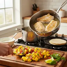 It's best to eat everything right away. However, if you have leftover ingredients, store them separately in the fridge in airtight containers. Salsa can be stored for up to 2 days. The fried fish can be reheated in an oven preheated to 200°C or in an air fryer for a few minutes to regain its crispiness - avoid the microwave, which will make the coating soggy.