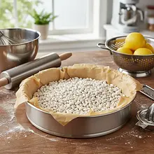 This technique is known as 'blind baking,' which ensures that the crust will be fully baked and crispy, even after adding a wet cream. The paper must be larger than the pan to easily remove it with the weight.
