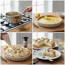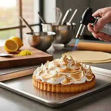 Using a kitchen torch, caramelize the meringue, moving the flame a few centimeters away from its surface until the peaks turn a beautiful golden-brown color. If you don't have a torch, place the tart in an oven preheated to 220°C with the grill function on (heating from above) for 1-2 minutes, keeping a close eye to ensure the meringue doesn't burn.