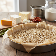 Line the pastry in the mold with baking paper and weigh it down with special ceramic balls, dry beans, or peas. This is called 'blind baking', which prevents the bottom from puffing up. Place it in the preheated oven and bake for 15 minutes. After that time, carefully remove the paper with the weights and bake for another 10 minutes, until the bottom is lightly browned and dry to the touch. Remove from the oven and set aside.