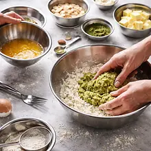 Prepare a work surface/large bowl and sift the wheat flour into the bowl. Add the almond flour, powdered sugar (50 g from the specified amount), a pinch of salt, and mix evenly with a wooden spoon.