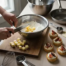Take the butter out of the fridge and cut it into small cubes (about 1x1 cm). Add the butter cubes to the flour. Using your fingertips or a pastry cutter, quickly rub the butter into the flour until the mixture resembles wet sand with visible pea-sized lumps of butter. Work quickly to prevent the butter from melting.