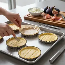 Prick the bottom of each tartlet with a fork in several places. Then cover the dough with a piece of baking paper and weigh it down with dry beans, rice, or special ceramic balls. This is called 'blind baking', which prevents the dough from puffing up.