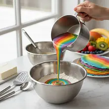 Wylej na patelnię małą porcję (ok. 1/4 szklanki) kolorowego ciasta, np. różowego. Od razu chwyć patelnię za rączkę i wykonuj okrężne ruchy, aby ciasto rozpłynęło się cienką, równą warstwą po całej powierzchni. Smaż przez około 60-90 sekund, aż powierzchnia naleśnika stanie się matowa, a brzegi zaczną się lekko unosić.