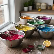Do każdej miseczki z ciastem dodaj inny barwnik. Do pierwszej dodaj łyżkę soku z buraka i wymieszaj do uzyskania różowego koloru. Do drugiej dodaj pastę z kurkumy dla żółtego koloru. Do trzeciej dodaj łyżkę purée ze szpinaku dla zieleni. Czwartą miseczkę zostaw w naturalnym, kremowym kolorze. Dokładnie wymieszaj ciasto w każdej miseczce osobną łyżką.