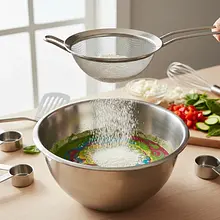 Now it's time for the dry ingredients. Place a sieve over the bowl with the liquid ingredients and sift all the flour and a pinch of salt through it. Sifting will aerate the flour and prevent lumps from forming. Using a whisk, start mixing the ingredients, making movements from the center to the outside, gradually incorporating the flour into the liquid. Mix vigorously for 1-2 minutes until the batter is smooth and lump-free. Finally, pour in 2 tablespoons of oil and mix again.