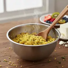 Pour the dry millet into a fine mesh sieve. First, rinse it thoroughly with boiling water from the kettle, moving the sieve around so that all the millet is blanched. Then, rinse it under cold running water for about a minute, mixing it with your hand until the water flowing from the sieve is completely clear. This step is crucial to remove the natural bitterness of the millet.
