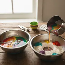 Do drugiej miseczki dodaj barwnik różowy. Mrożone maliny umieść w małej miseczce i podgrzej w mikrofalówce przez 20-30 sekund, aż puszczą sok. Następnie przetrzyj je przez gęste sitko, aby pozbyć się pestek. Otrzymany gładki mus malinowy dodaj do ciasta i wymieszaj do uzyskania pięknego, różowego odcienia.