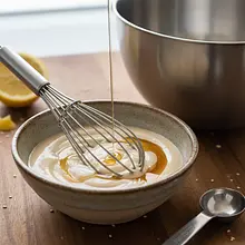 In a small bowl or jar, combine tahini paste, freshly squeezed lemon juice, maple syrup, and garlic pressed through a garlic press. Start mixing everything with a small whisk or fork. You will notice that at first the sauce will become very thick and lumpy – this is a normal reaction. Now, while continuously mixing, begin to add cold water, one tablespoon at a time, until the sauce reaches a smooth, pourable consistency resembling thin mayonnaise. Season to taste with a pinch of salt.