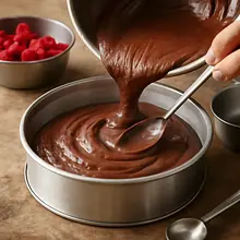 Gradually pour the cooled melted butter mixed with milk into the whipped mixture in a thin stream, gently mixing with a spatula just until combined. Then add the dry ingredients (flour + cocoa + baking powder) in two batches, gently folding the mixture from the bottom up each time to avoid releasing the air.