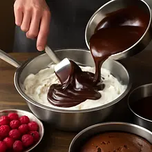 Gently fold in about 200–250 g of slightly cooled ganache into the whipped cream in two batches: first add 1/3 and mix vigorously with a spatula to even out the consistency, then add the rest and fold gently until the cream is smooth and uniform. Keep the remaining ganache for drizzling on top (chill to achieve a thicker consistency).