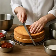 Cut the completely cooled sponge cake into two equal horizontal layers using a long serrated knife or a cake wire. Place the bottom layer on a rotating plate or cake stand. Soak the bottom evenly with the prepared raspberry syrup (about 2–3 tablespoons of syrup per layer) — apply with a brush, leaving the edges dry to avoid softening the cake.