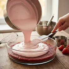 In a large bowl, place the mascarpone cheese and briefly mix it to loosen its texture. Add the cooled white chocolate and mix until combined. Then, while continuously mixing on low speed, slowly pour in the strawberry puree with gelatin. Mix only until you achieve a smooth, pink mixture.
