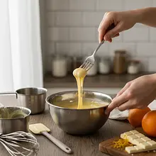In a separate small bowl, beat the eggs with a fork until you achieve a uniform consistency. Slowly, in a thin stream, pour the beaten eggs into the slightly cooled honey mixture, while vigorously stirring the mixture with a whisk. The goal is to prevent the eggs from curdling due to the heat. Stir until completely combined.