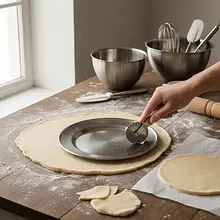 From each rolled-out dough piece, cut out a circle with a diameter of about 22-23 cm. You can use a plate or the edge of a springform pan as a template for this. Leave the cut scraps of dough next to the cut circle on the paper – they will bake together with it and will be used later for decoration.