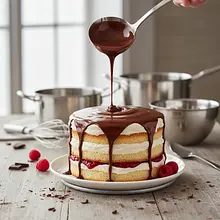 Prepare the glaze. In a small saucepan, place the broken dark chocolate and the remaining 30g of butter. Melt in a water bath or over very low heat, stirring constantly until a smooth, shiny glaze forms. Let it cool slightly.