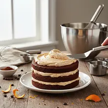 The Spartak cake is a classic, multi-layered dessert originating from Eastern Europe, valued for its extraordinary texture and depth of flavor. In this unique version, the traditional honey-cocoa layers have been enriched with an intense coffee note, giving them a more sophisticated and deep aroma. They are filled with a velvety cream based on mascarpone cheese and fluffy whipped cream, with a refreshing hint of fresh orange zest that perfectly balances the sweetness of the cake. The whole is topped with a glossy dark chocolate glaze. After chilling, the cake becomes moist and melts in your mouth, with each layer perfectly complementing the others, creating a harmonious whole. It is an incredibly visually impressive dessert, perfect for special occasions, which will surely delight guests with its richness of flavors and elegant appearance.