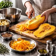 Preheat the oven to 200°C (top and bottom). Peel the pumpkin with a vegetable peeler, cut it in half, remove the seeds with a spoon, and cut the flesh into even cubes about 2–3 cm on each side. Place the pumpkin cubes in a large bowl, add canola oil (15 g), sprinkle evenly with 1 g of salt and 1 g of pepper. Mix by hand or with a spoon so that all pieces are thinly coated with oil and spices.