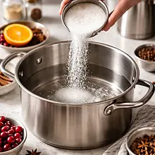 In a large pot with a capacity of at least 2 liters, place 800 ml of water, 80 g of sugar, and optionally 40 g of honey (if using – it replaces part of the sugar). Add 300 g of cranberries, 14 g of cinnamon sticks (2 sticks), 3 g of cloves (6 pieces), and 8 g of star anise (2 pieces) along with the grated orange zest. Also add 1 g of salt. Heat over medium heat until it comes to a boil, stirring with a wooden spoon to dissolve the sugar.