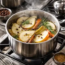 Warm, aromatic spiced apple-pear cider is a traditional, seasonal drink perfect for chilly days. It combines the natural sweetness of fresh apples and pears with warming spices: cloves, cinnamon, and a hint of ginger. The addition of rosemary introduces an unexpected, piney note, while a slice of lemon adds freshness. The drink has a golden-copper color, an intense aroma of spices, and an enticing steam rising from the glasses — it looks very impressive served in wine glasses or clear mugs. It can be served alcohol-free or with a splash of rum (optional). Perfect for holiday evenings, social gatherings, or as a warming drink by the fireplace.