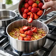 Add the strawberries to the pot with rhubarb and cook for another 3-4 minutes — the strawberries should soften and release their juice, but not break down completely. Turn off the heat, add 60 ml of lemon juice and a pinch of salt (1 g). If you want a floral version, add 30 ml of elderflower syrup now (optional). Taste the liquid — if it is too sour, add up to 1 tablespoon (15 g) of sugar and stir. Leave the compote to cool in the pot for about 20-30 minutes.