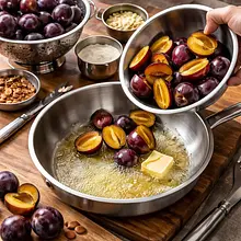 Wash 600 g of plums, cut them in half and remove the pits. In a medium skillet, melt 20 g of butter, add the plums cut side up, 50 g of honey, 4 g of cinnamon, and 30 ml of lemon juice. Simmer over medium heat for 8–10 minutes — the plums should soften and release juice but maintain their shape. Remove from heat when a light, shiny syrup forms.