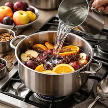 In a large pot with a capacity of at least 3 l, pour in 1.5 liters of water and place it on the stove over medium heat. Add cinnamon sticks, star anise, and cloves. Heat until the water begins to gently boil (small bubbles at the bottom), which will take about 7-10 minutes from the moment you turn on the burner.
