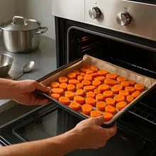 Place the baking tray with carrots in the preheated oven. Bake for about 25-30 minutes. Halfway through baking (after about 15 minutes), stir the carrots with a spatula to ensure they brown evenly. The carrots are ready when they become soft (you can easily check this by piercing them with a fork) and slightly caramelized at the edges. After baking, remove the tray from the oven and set aside to cool slightly.