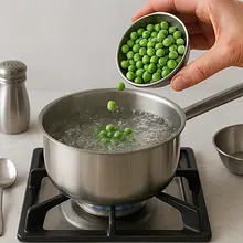 In a small pot, bring about 1 liter of water to a boil with a large pinch of salt. Once boiling, add the frozen peas and cook for 2-3 minutes from the moment it comes back to a boil. The peas should be bright green and tender, but not overcooked. Immediately after cooking, drain them in a colander and rinse thoroughly with cold water or immerse in a bowl of water and ice. This process, called blanching, will stop the cooking process and preserve the beautiful, vibrant color of the peas.