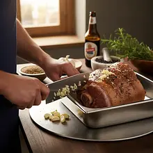 Serve the pork knuckle whole on a large wooden board, which makes a huge impression on guests. Next to it, place small bowls with spicy mustard, freshly grated horseradish, and a jar of pickled cucumbers or marinated peppers. Be sure to serve fresh, country sourdough bread for dipping in the sauce. Of course, the best drink will be chilled Czech dark beer, the same one used for roasting.