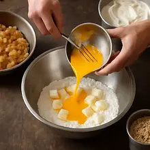 Crack 60 g of egg into a small bowl, whisk with a fork, and pour into the flour and butter mixture. Quickly knead the ingredients with a wooden spoon until the mixture begins to come together. Transfer to a lightly floured surface and press down, forming a disk. Wrap in plastic wrap and chill in the refrigerator for 30-40 minutes.