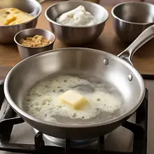 Heat a medium skillet over medium heat, add 15 g of butter. When the butter melts and starts to foam slightly (about 30 seconds), add the chopped apples and 80 g of sugar. Sauté, stirring every 1-2 minutes for 6-8 minutes, until the apples begin to soften but do not break down completely.