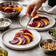 Preheat the oven to 200°C (top-bottom). Wash the beets under cold water, trim the stems and root with a knife. Do not peel. Wrap each beet individually in aluminum foil (to prevent juice loss). Place them on a baking sheet and bake for 45–60 minutes (the time depends on size; for 800 g, 45–50 minutes is usually sufficient). Check for doneness: insert a sharp knife or toothpick into the largest beet — if it goes in easily, the beets are done.