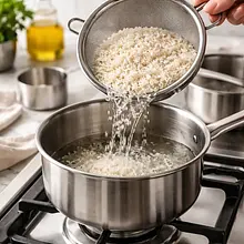 Measure 160 g of jasmine rice and transfer it to a small sieve. Rinse under cold running water for about 1-2 minutes, stirring with your hand, until the water is almost clear. This will remove excess starch and ensure the rice is fluffy after cooking.