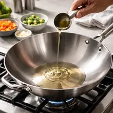 In a large skillet (wok), heat 30 g of rapeseed oil over medium heat. When the oil is hot (slightly shimmering), add the onion (150 g). Sauté for 4-5 minutes, stirring with a wooden spoon, until the onion becomes soft and translucent — be careful not to let it brown too much. Add the chopped garlic and ginger and sauté for another 30-45 seconds, until you smell a strong aroma (be careful not to burn the garlic).